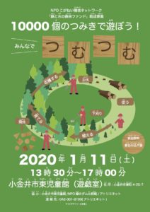 「みんなでつむつむ(Part2)」(東児童館) イベント情報 2019.12.31 2019.12.25 2020年最初のイベントとして実施します。NPO緑のダム北相模に今回もご協力いただき、東児童館との連携企画です。 「10000個のつみきで遊ぼう!みんなでつむつむ(Part2)」◯1月11日(土)13時30分~17時◯小金井市東児童館(遊戯室) 近隣の皆さん、ぜひご参加ください。